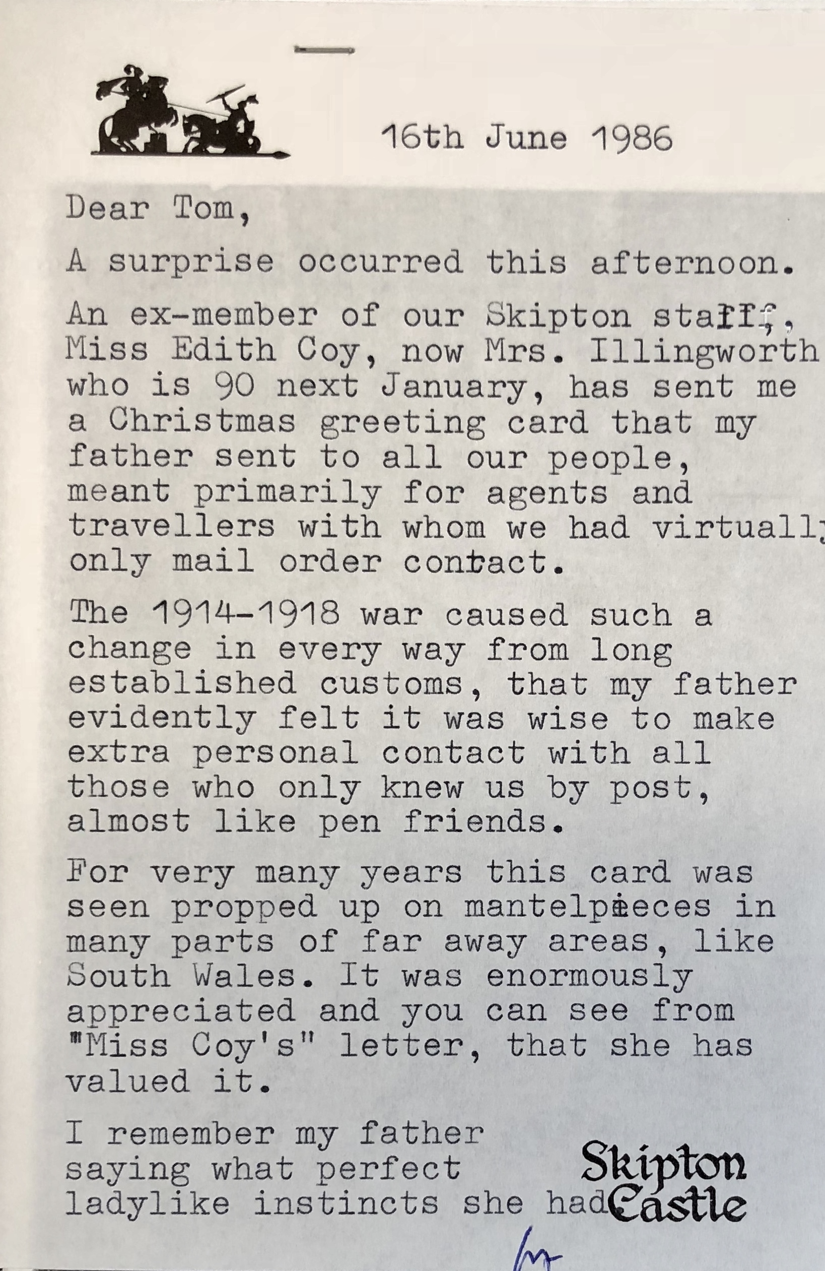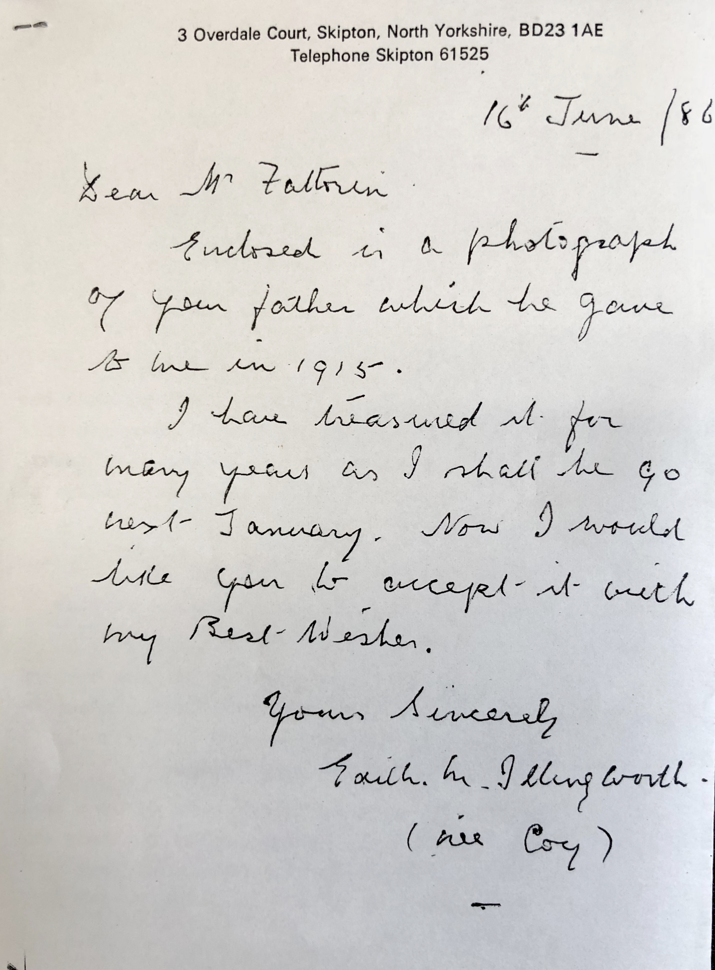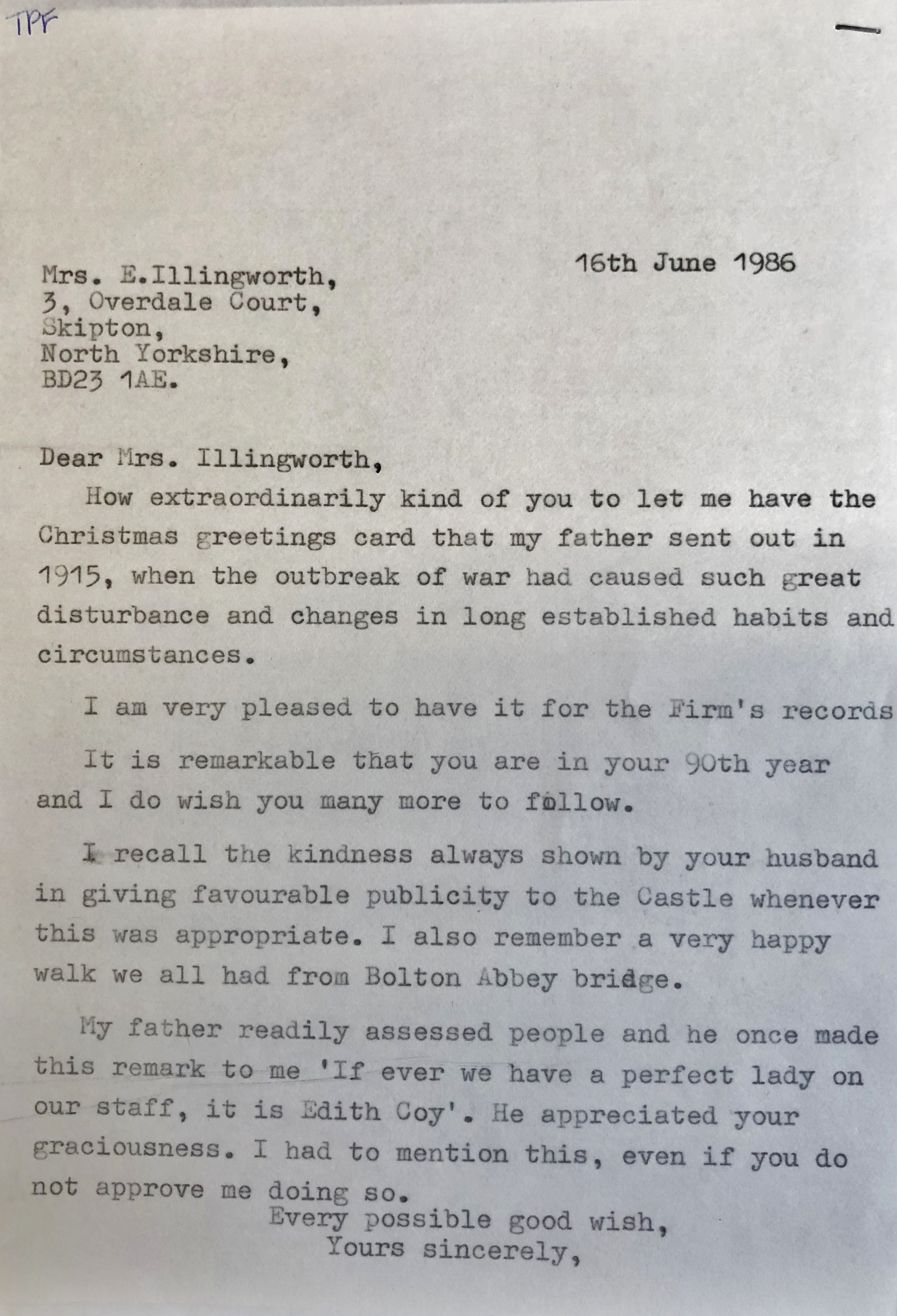 Letter from Mrs E Illingworth to WF 1986